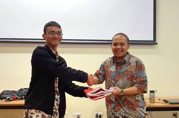 Penyerahan tampuk kepemimpinan secara simbolik dari Ketua Indosoc Sheffield peride 2014-2015, saudara Razie Hanafi (kanan) kepada Ketua Indosoc Sheffield terpilih, saudara Indra Yudhipratama (kiri)