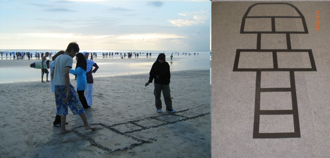 - Engkle: This game is child’s play performed by using a special image in the media area of land with kereweng plate. A fraction Kereweng isthmus formed round about 5 cm in diameter. Engkle usually played by girls, but sometimes there are also boys who participated. The image formed on the ground usually with a square-shaped (called home) with the formation of 6 parts. Or there is that uses 8 plus mountain formation (half-circle picture) at the end. Engkle called, because this game each player does not have to do engkle or tiptoe (hopscotch) with one leg to go through every part of the house. Players may only be lower both legs at a house he owned, or the picture area of the mountain. The game begins with one player throwing a abak house kereweng to an agreed area. Then the player must engkle to encourage abak use fingertips to each stage of the home box, and so on.